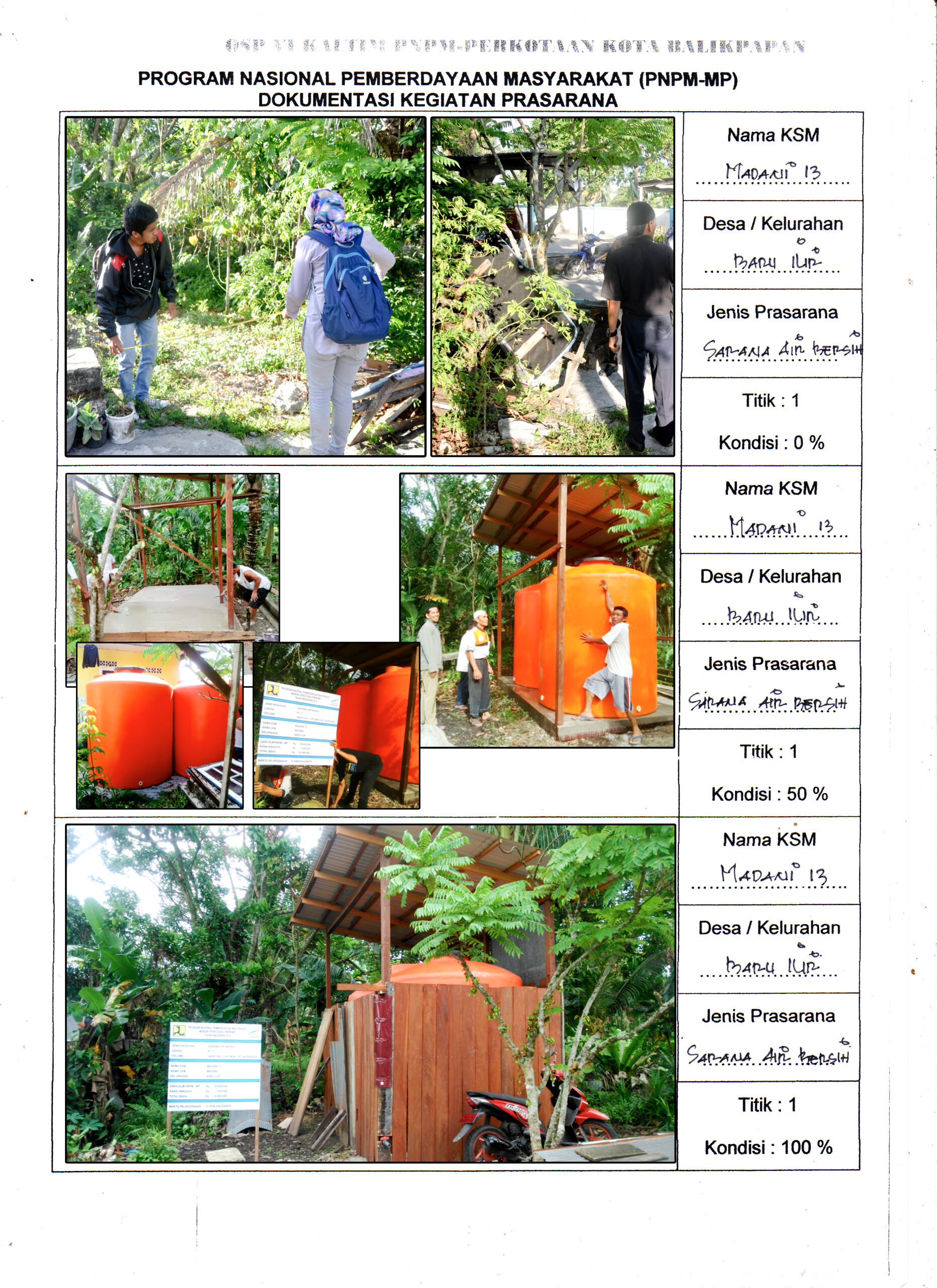 Hari ini KSM Madani RT 13 telah menyelesaikan pembangunan sarana penampungan air bersih yang menjadi program kegiatan LKM Madani Baru Ilir yang melalui BLM tahun 2014 yang dikerjakan di Januari 2015 ini telah berhasil memberikan solusi terhadap permasalah masyarakat di lingkungan RT 13 Kelurahan Baru Ilir yang selama ini telah bertahun tahun menjalani kondisi kesulitan air bersih dikarenakan kurangnya suplai air bersih oleh jalur PDAM karena tingginya  kawasan tersebut.